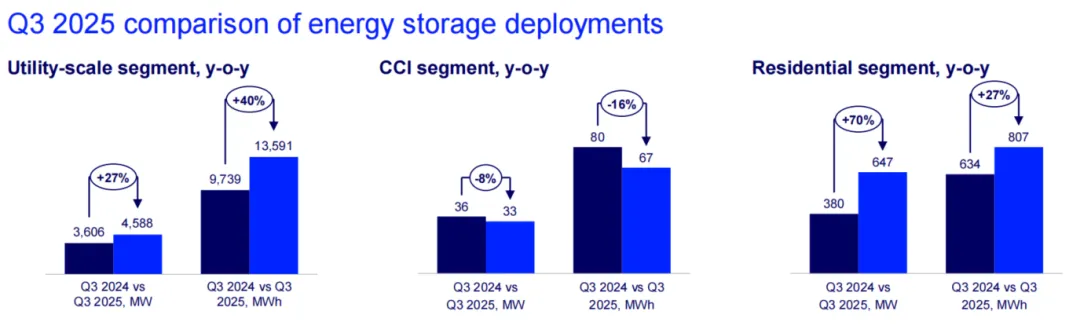 图:2024年Q3与2025Q3美国电网级储能/工商储/户储装机量对比