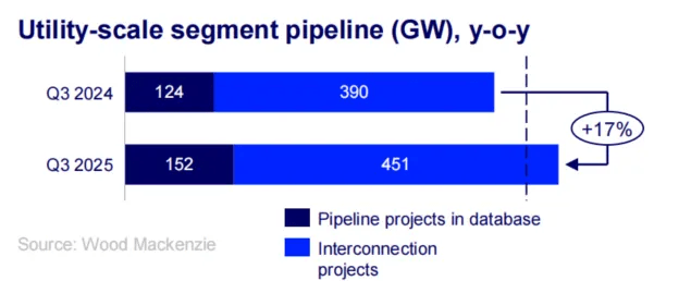 2025年第三季度,美国电网级储能中,待实施项目152个,处于申请并网阶段的项目451个,二者总计603个,较2024年同期514个增长17%。