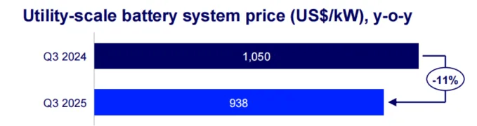 价格上看,2025年第三季度美国电网级储能系统价格为938美元/kW,较去年同期的1050美元/kW同比下降11%。