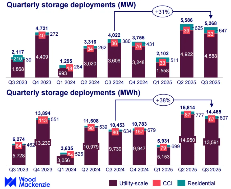 2025年第三季度美国新增储能装机总量达5.268GW/14.465GWh,与去年同期的4.022GW/10.453GWh相比,同比增长31%/38%